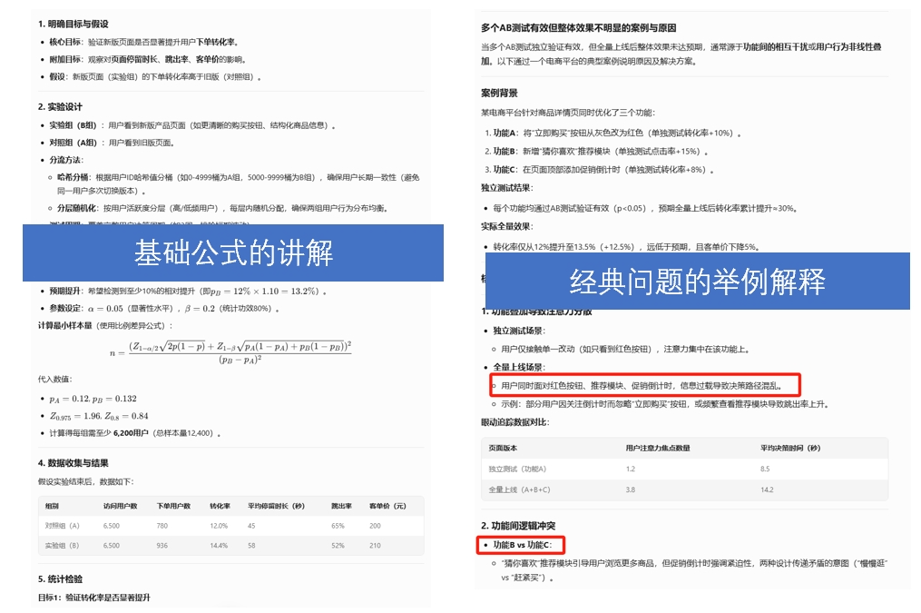 有趣的是:利用Deepseek學習建模/ABtest,效果非常好。DS不但熟悉公式,而且常見問題的舉例也非常精準(如下圖)。